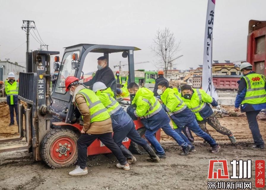 恰逢雨天,道路泥濘。運送重型設(shè)備的叉車陷入呢泥潭,眾人協(xié)力推車。(邁瑞醫(yī)療供圖)