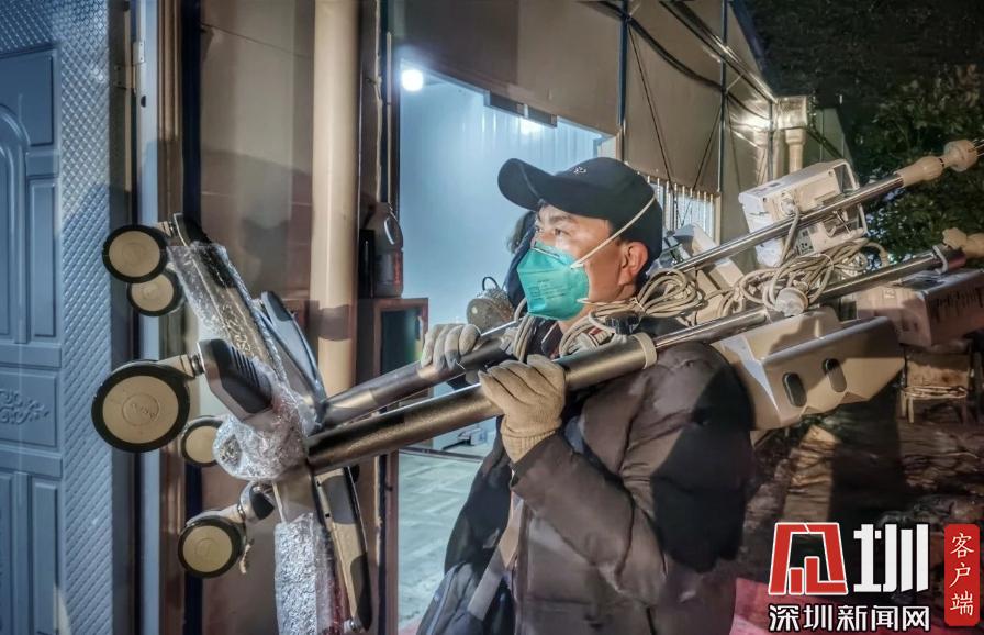 2月2日,工作人員將邁瑞設(shè)備扛進火神山醫(yī)院儲藏室。(邁瑞醫(yī)療供圖)