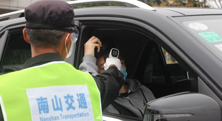圖說(shuō):協(xié)同合作,街道同志測(cè)體溫,公安同志派發(fā)溫馨提示。