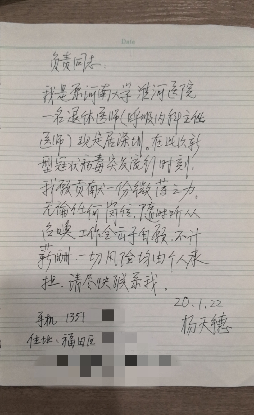 深圳新聞網(wǎng)2月4日訊(見圳客戶端、深圳新聞網(wǎng)記者 邱曉潔)1月23日,福田街道海濱社區(qū)工作站收到一封請(qǐng)?jiān)笗?,上面寫著:“我愿貢獻(xiàn)一份微薄之力,無(wú)論任何崗位,隨時(shí)聽從召喚,工作全出于自愿,不計(jì)薪酬,一切風(fēng)險(xiǎn)均由個(gè)人承擔(dān)?!痹谡?qǐng)?jiān)笗淖詈?,還附上了自己和愛(ài)人的聯(lián)系電話及住址。