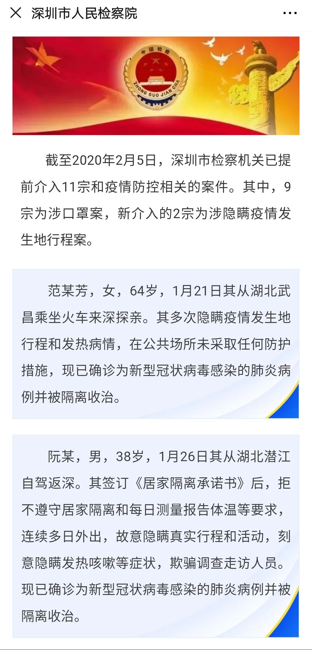 見(jiàn)圳客戶端.深圳新聞網(wǎng)2020年2月5日訊(見(jiàn)圳客戶端、深圳新聞網(wǎng)記者 張玲)截至2020年2月5日,深圳市檢察機(jī)關(guān)已提前介入11宗和疫情防控相關(guān)的案件。其中,9宗為涉口罩案,新介入的2宗為涉隱瞞疫情發(fā)生地行程案。