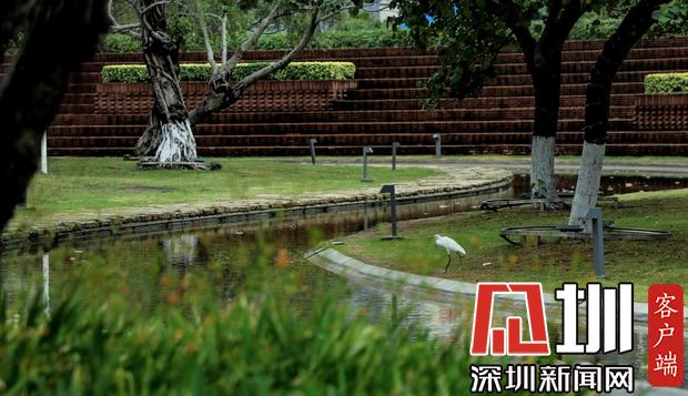 海濱廣場(chǎng),一只白鷺棲息在無人的草地上悠閑的踱步。