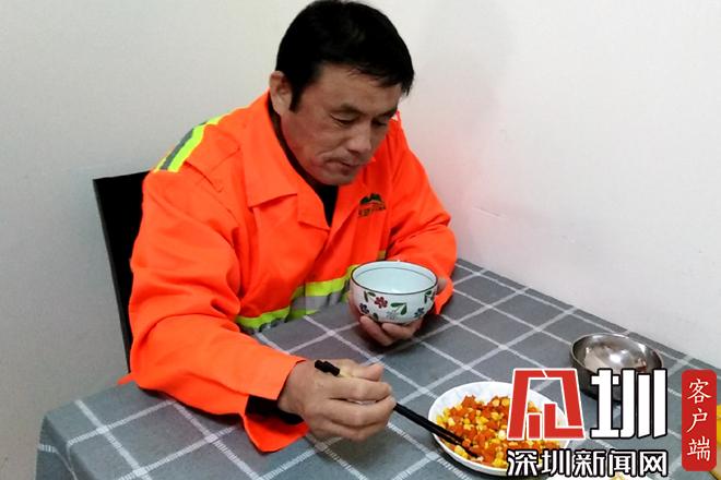 胡蘿卜丁炒玉米,再加一碟土豆絲下飯,這就是黃學志的午餐。黃學志說,他有幾年沒回老家了,本來計劃春節(jié)回去過年,順便帶老伴看病,沒想到疫情越來越嚴重,于是就打消了這個念頭。疫情發(fā)生以來,除了日常工作,他還要負責為值班同事普及疫情防控知識的任務。從早上7點半到12點半,下午1點半到5點半,他每天在沙頭角7個垃圾轉(zhuǎn)運站、18個公廁來回奔走,給同事配送口罩及消毒用品,檢查他們的身體健康情況?!艾F(xiàn)在是疫情防控關(guān)鍵期,我們也希望為防控工作貢獻出來自環(huán)衛(wèi)清潔行業(yè)的一份力量。”黃學志說。(見圳客戶端、深圳新聞網(wǎng)記者鄧雪婷)