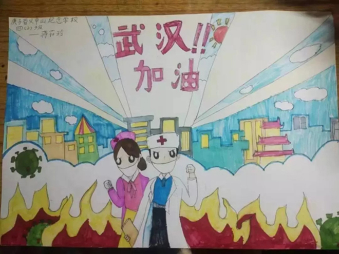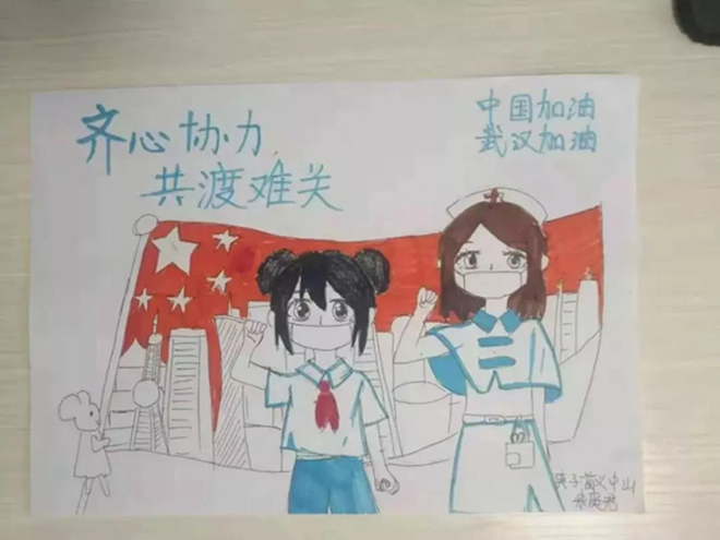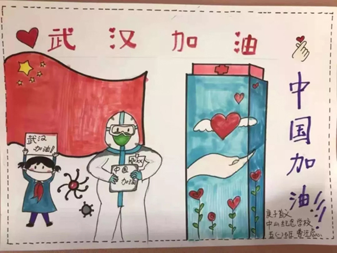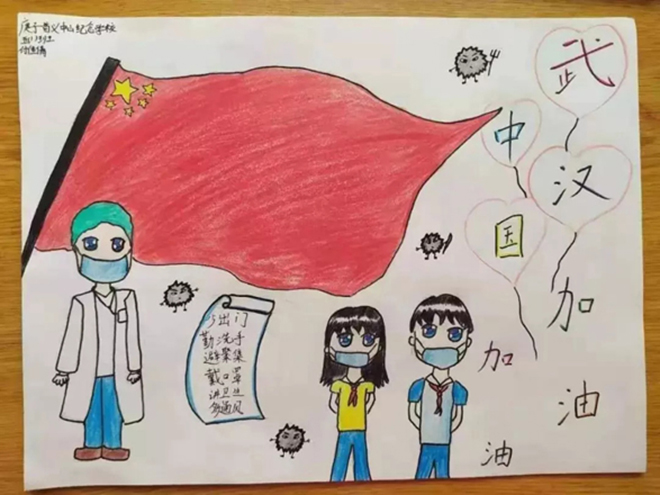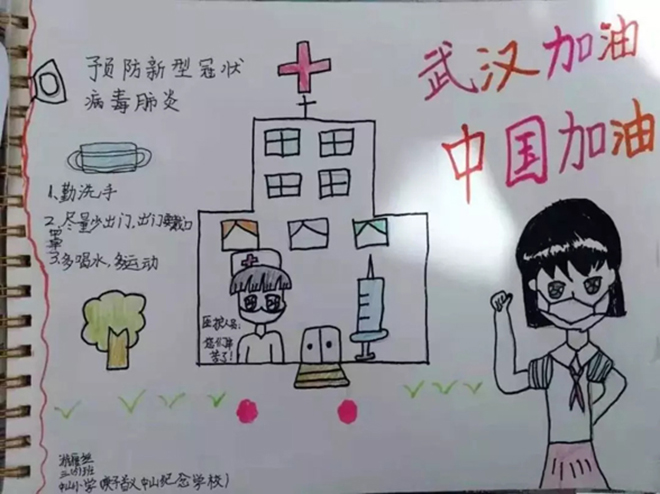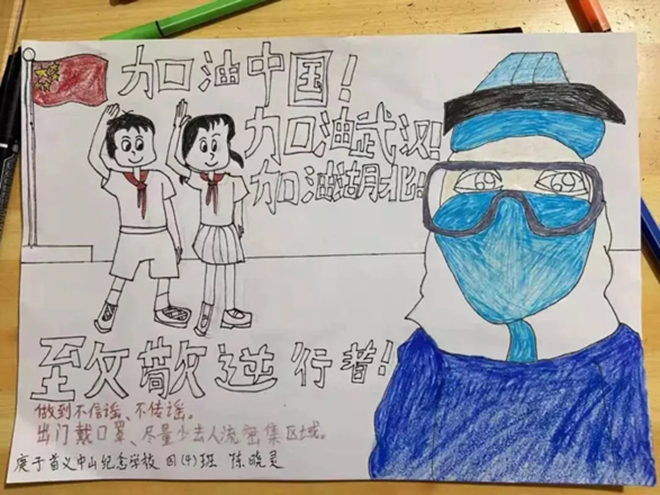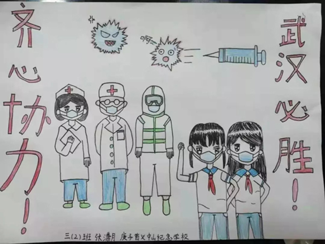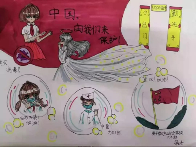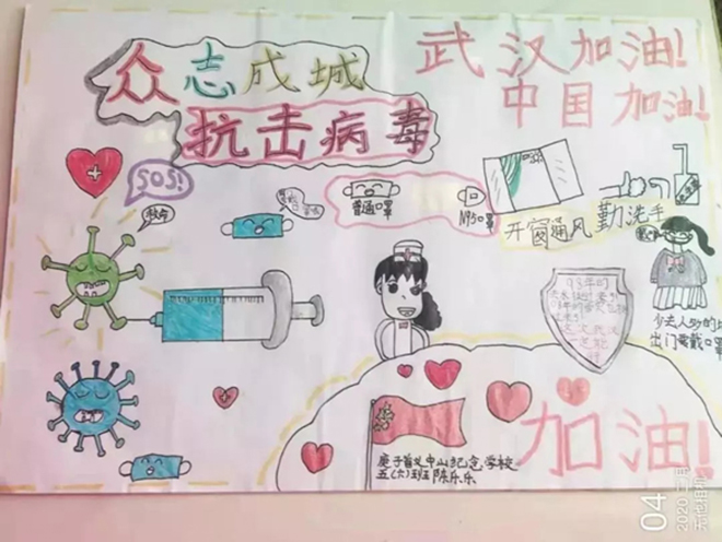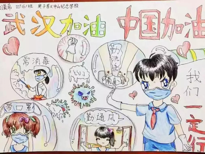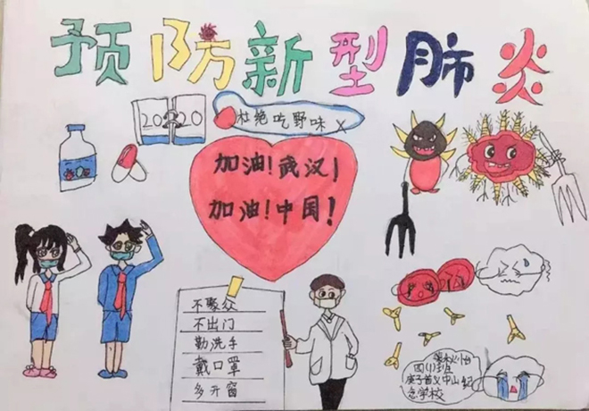 一(1)中隊的張明堯、四(6)中隊的劉晨希等同學用繪制手抄報的形式詮釋“預防新型冠狀病毒感染的肺炎,從我做起”。