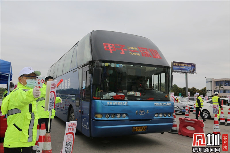 大巴車到來時,工作變得復雜了些,不僅需要引導車上所有人員有序下車、依次接受檢驗檢疫,遇到?jīng)]帶身份證的乘客,還要帶他們到現(xiàn)場公安處核查身份。如有湖北籍乘客,還需提示其到復檢區(qū)登記信息。