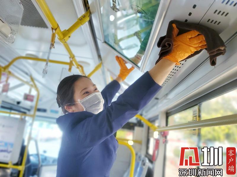 深圳巴士集團(tuán)四分公司工作人員對(duì)公交車進(jìn)行消毒擦洗。