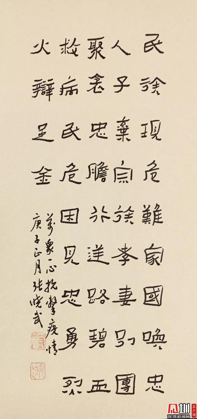 見(jiàn)圳客戶端.深圳新聞網(wǎng)訊(記者 鄭創(chuàng)彬)連日來(lái),新型冠狀病毒肺炎疫情牽動(dòng)著每一個(gè)國(guó)人的心。2月11日,記者從鹽田區(qū)文聯(lián)獲悉,鹽田區(qū)書(shū)法家協(xié)會(huì)的成員們,雖不能和醫(yī)務(wù)工作者等直奔前線,卻無(wú)不心系疫情,利用自己手中的筆墨,以文藝作品鼓舞士氣,創(chuàng)作了許多凝聚力量的佳作,為打贏疫情防控阻擊戰(zhàn)加油助威。