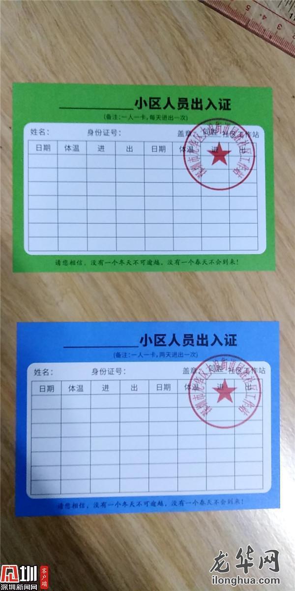 近日,根據(jù)不同居民的情況和需求,大浪街道用四種顏色的卡片對(duì)居民出入進(jìn)行分類管理:紅色是有發(fā)熱等異常癥狀、按要求正在居家隔離的人員,黃色是來深14天內(nèi),正在居家隔離且無異常癥狀的人員,可視情況轉(zhuǎn)為其他管理模式。紅、黃兩類人員嚴(yán)禁其出門,由社區(qū)工作站提供物資采購(gòu)、幫送服務(wù)。藍(lán)色是沒有居家隔離、身體狀況正常的在家人員,憑證可以兩天出入1次;綠色是沒有居家隔離、身體狀況正常的上班人員,憑證每天可以出入1次。