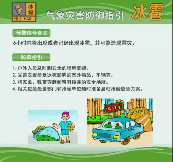冰雹橙色預(yù)警信號(hào)表示6小時(shí)內(nèi)將出現(xiàn)或者已經(jīng)出現(xiàn)冰雹,并可能造成雹災(zāi)。