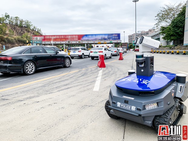 警用巡視機(jī)器人“建國(guó)”在深圳高速路口執(zhí)行巡邏任務(wù)。
