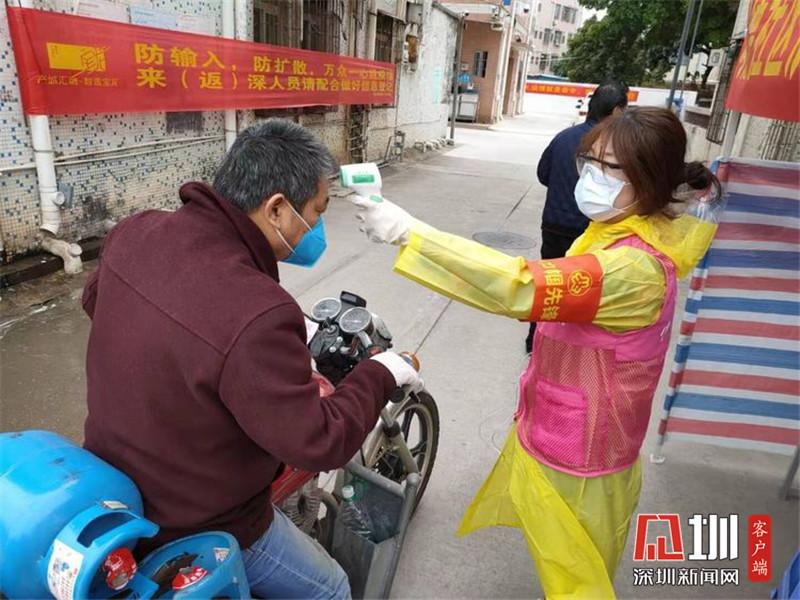 來自龍崗區(qū)南嶺村的鄧育芳,是不少租戶的房東,也是值守在南嶺南路黨員先鋒崗的一名村民志愿者。連續(xù)十多天,她每天在村口站立整整7個小時,不停為出入居民測量體溫、詢問來源地、查驗(yàn)申報二維碼、引導(dǎo)注冊。