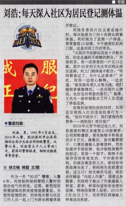 作為一名“90后”警察,入警6年,劉浩始終保持著剛?cè)刖瘯r(shí)的那份銳氣和拼勁。近期,新型冠狀病毒感染的肺炎疫情逐漸蔓延。為做好疫情防控,劉浩每天都與社區(qū)工作人員一起上門為群眾測(cè)量體溫并登記。