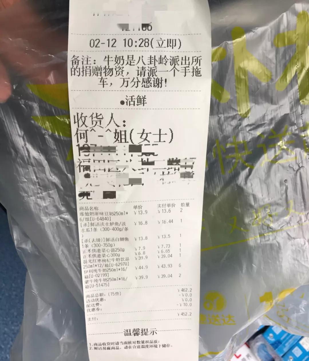 2月12日上午,一名群眾來到深圳市公安局福田分局八卦嶺派出所門口,送上防疫慰問物品。民警問及其姓名和聯(lián)系方式時,她只說:“民警的辛苦我們都看在眼里,這是我作為一名市民的心意和謝意?!北戕D(zhuǎn)身離開了。民警在清點紀錄物資時,無意中發(fā)現(xiàn)了該熱心市民訂購物資的一張采購單,八卦嶺派出所全體警務(wù)人員在這里對不肯留名的何女士表示衷心的感謝!疫情無情、人民有情,溫暖警心、堅定前行!