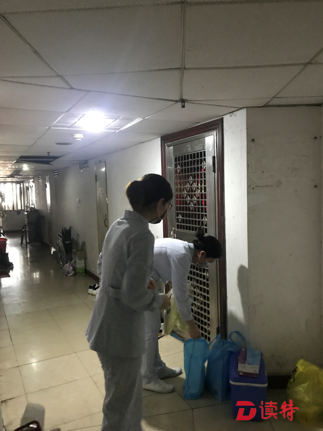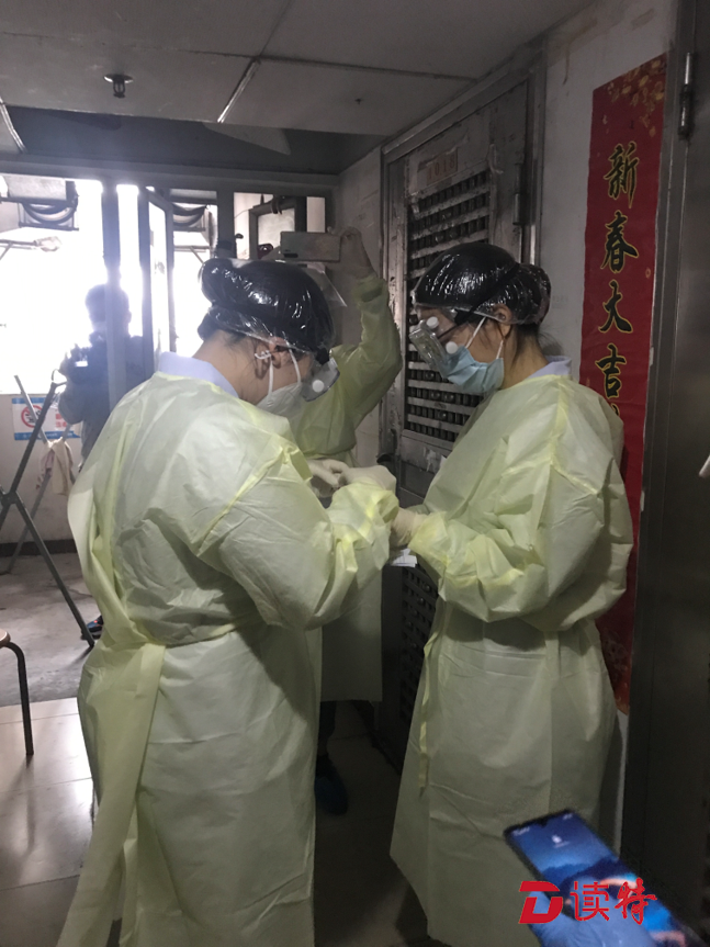孫女士打開門,將工作人員遞進(jìn)去的防護(hù)裝備穿戴完畢?!盀榱吮Wo(hù)醫(yī)護(hù)人員的安全,減少交叉感染的可能性,所有的上門檢測都會在樓道里進(jìn)行?!鄙缈抵行墓ぷ魅藛T說。提前穿好防隔服等防護(hù)裝備、拿檢測時(shí)給居民坐的凳子、為凳子消毒,開始進(jìn)行檢測前就需要做很細(xì)致的準(zhǔn)備工作。