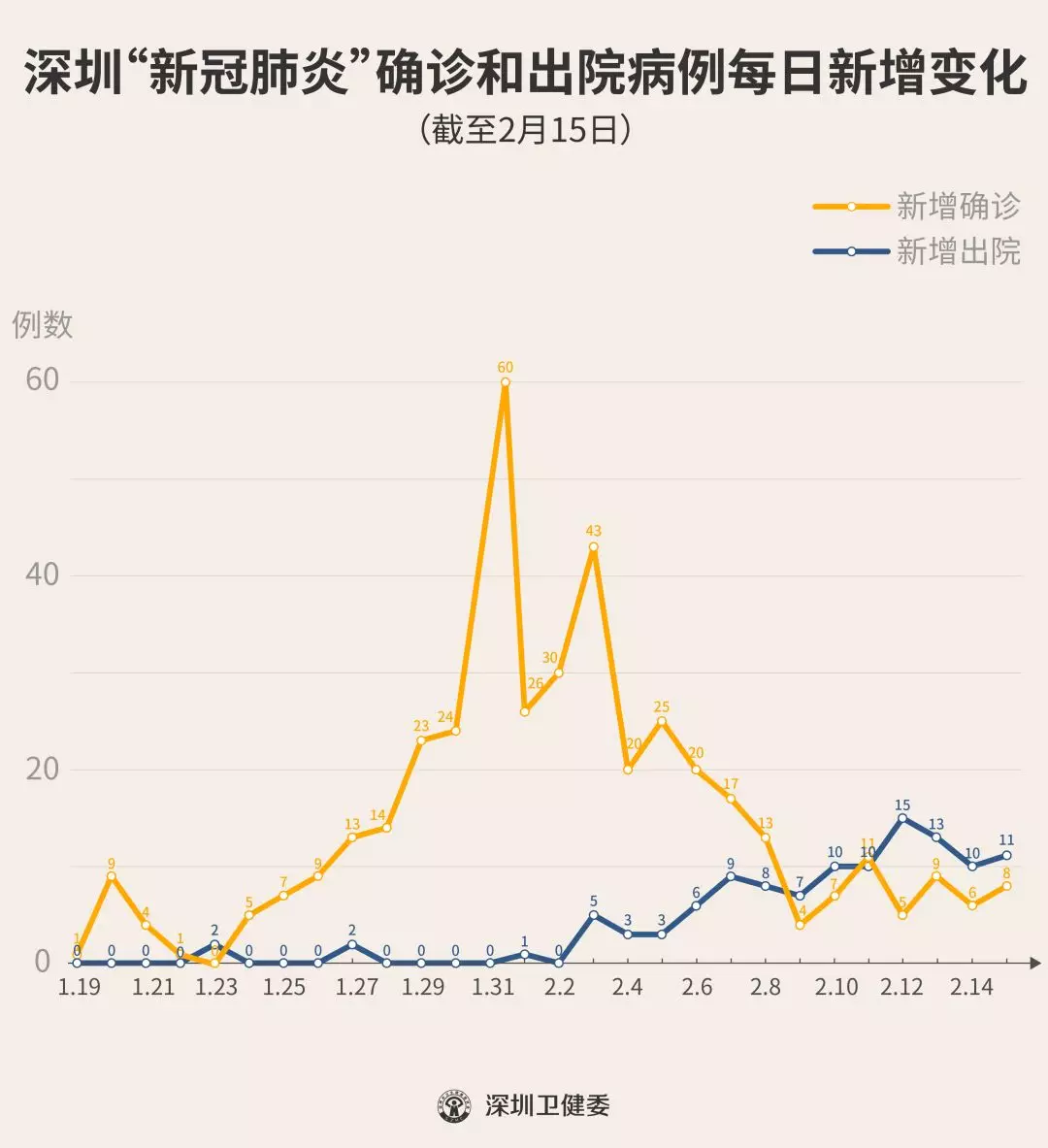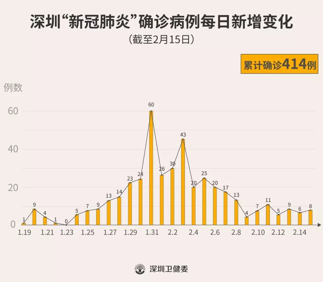 截至2月15日24時,深圳累計報告“新冠肺炎”確診病例414例。2月15日當(dāng)天全市新增確診病例8例(個案詳情今晚公布)。 ▲新增出院病例已超過新增確診病例 累計報告確診病例中,男性195例、女性219例。 按照病例管理地區(qū)劃分,南山區(qū)87例、福田區(qū)78例、龍崗區(qū)71例、寶安區(qū)62例、龍華區(qū)34例、羅湖區(qū)32例、光明區(qū)11例、坪山區(qū)7例、鹽田區(qū)6例、大鵬新區(qū)2例、其他(指由機(jī)場、車站、碼頭、關(guān)口、路卡等直接送往定點(diǎn)醫(yī)院的)24例。 目前,重癥29例、危重癥9例,無死亡病例,累計出院115例。 299例確診病例均在深圳市第三人民醫(yī)院隔離治療。 541例密切接觸者正在接受醫(yī)學(xué)觀察。 資料來源:深圳市疾控中心、深圳市衛(wèi)健委、廣東省衛(wèi)健委