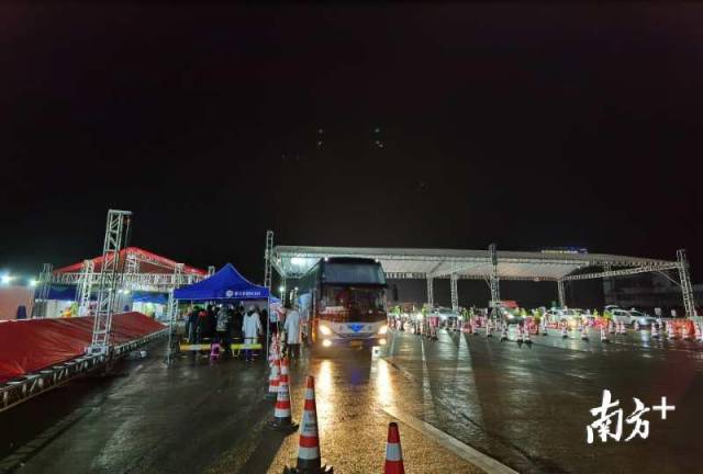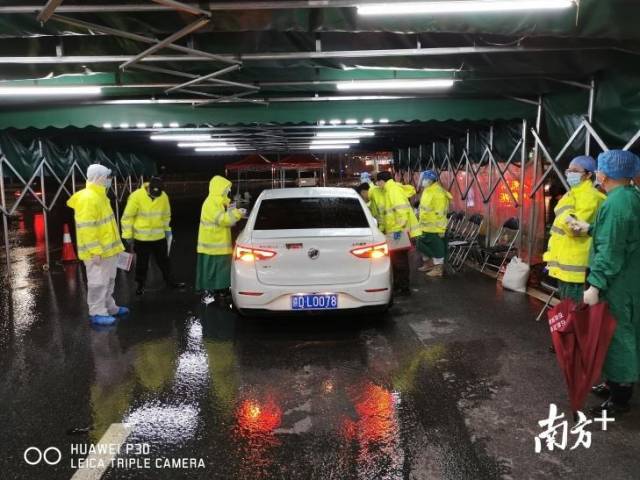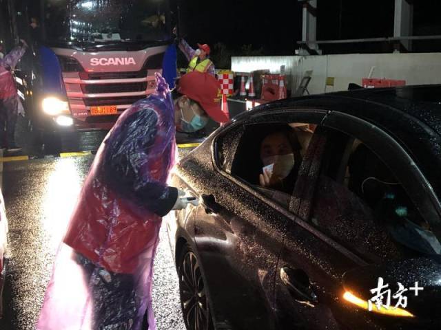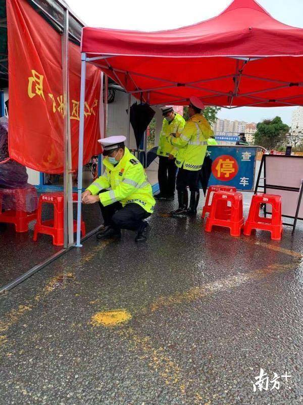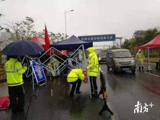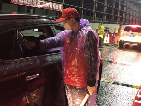 寶安區(qū)羅田檢疫站指揮部總指揮,石巖街道黨工委副書記、人大工委主任鄧亞虎,石巖街道副主任林志明和羅田交通聯(lián)合檢疫站臨時黨支部黨員冒雨檢查。當(dāng)晚,深圳市公安局經(jīng)偵支隊支援4名民警在現(xiàn)場冒雨防疫檢查。