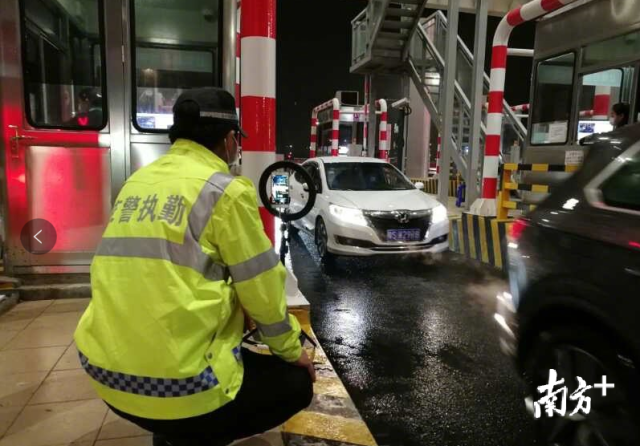 龍城街道黨員干部、工作人員與龍崗區(qū)退役軍人義工隊、龍崗交警組成防控隊伍,借助現(xiàn)場高速雨棚的遮擋,對進深車輛一一進行排查。
