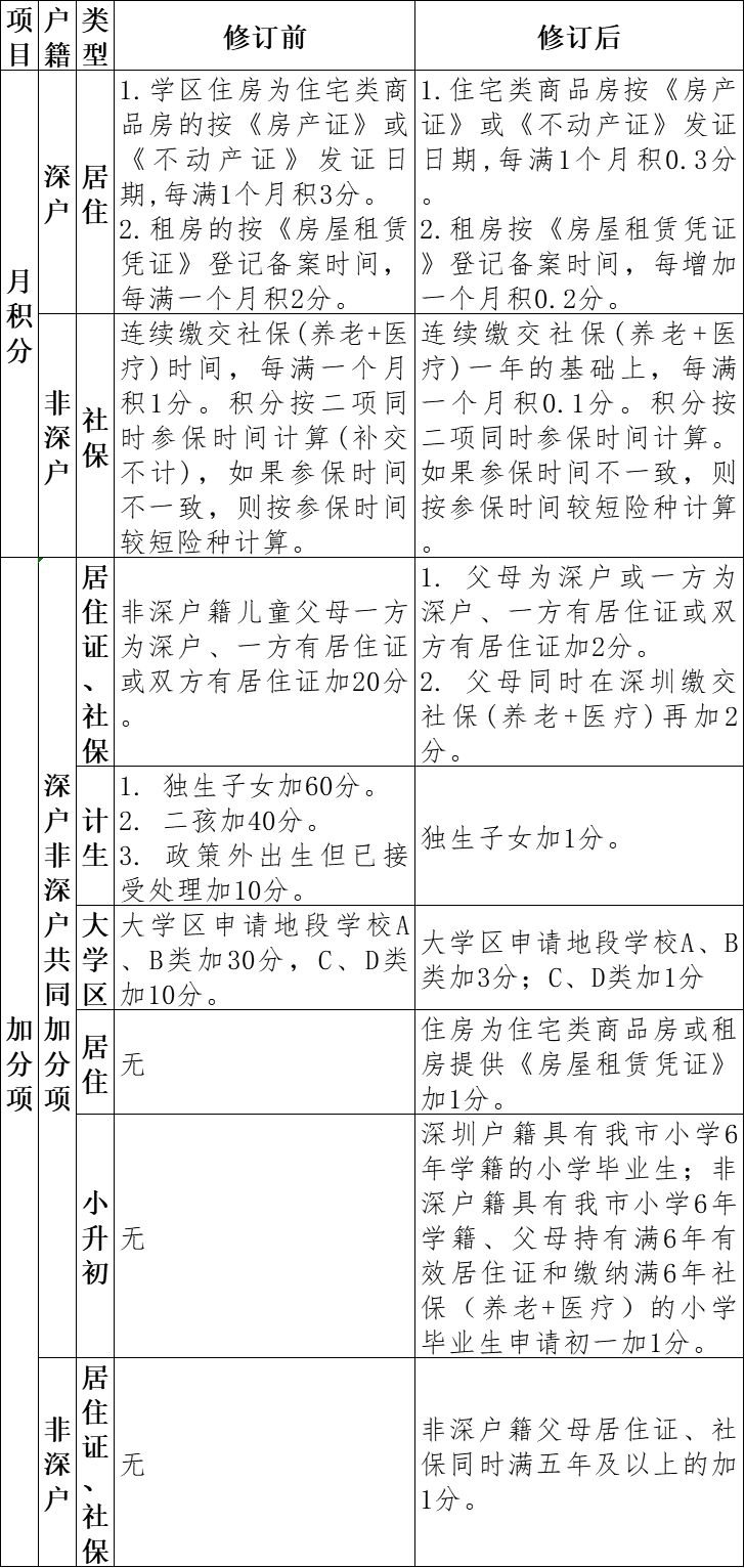 (3)非深圳戶籍兒童父母為深圳戶籍或雙方有居住證或一方有居住證另一方為深圳戶籍由原來加20分調(diào)整為2分;同時(shí),加分對(duì)象由非深戶調(diào)整為所有申請(qǐng)兒童。