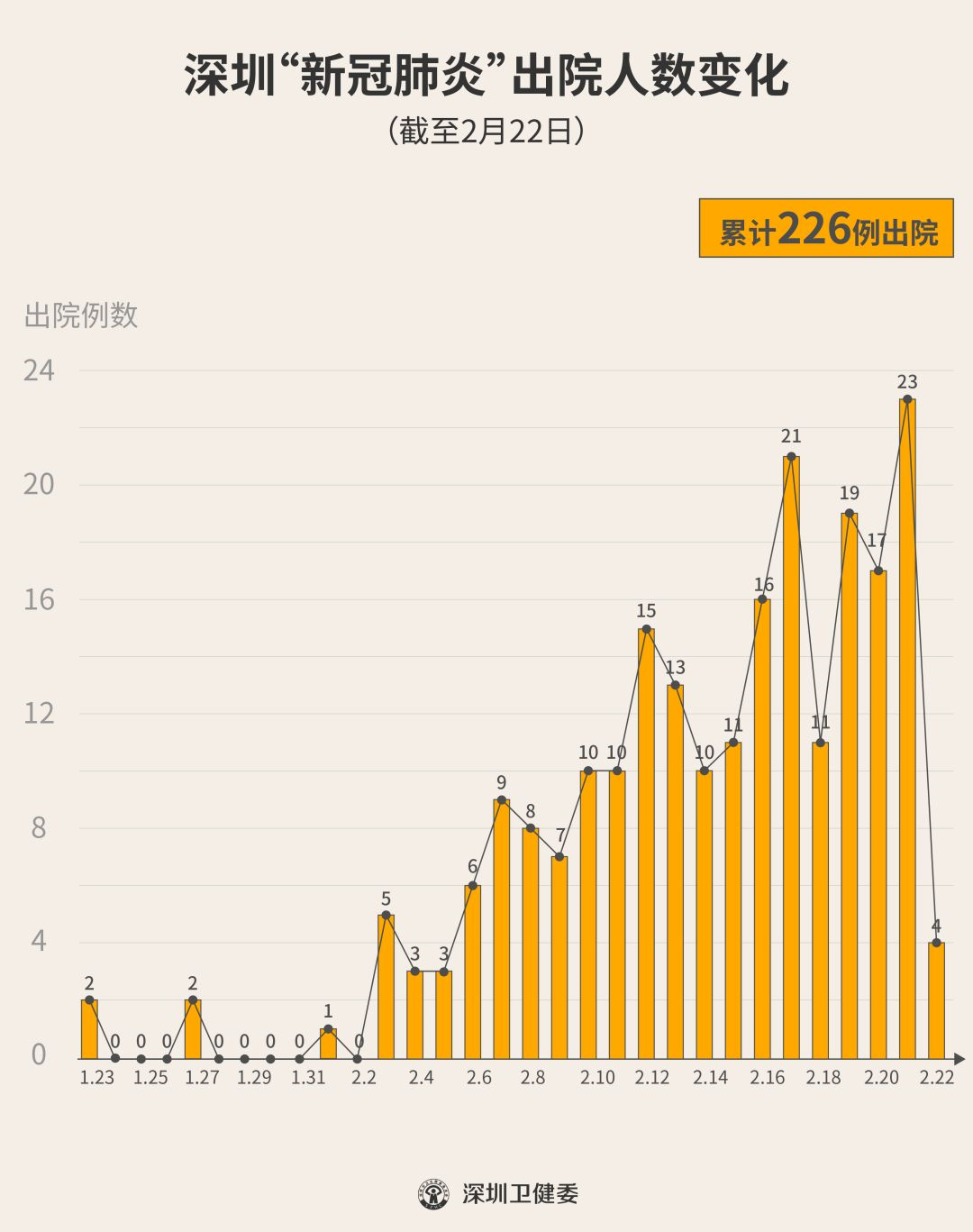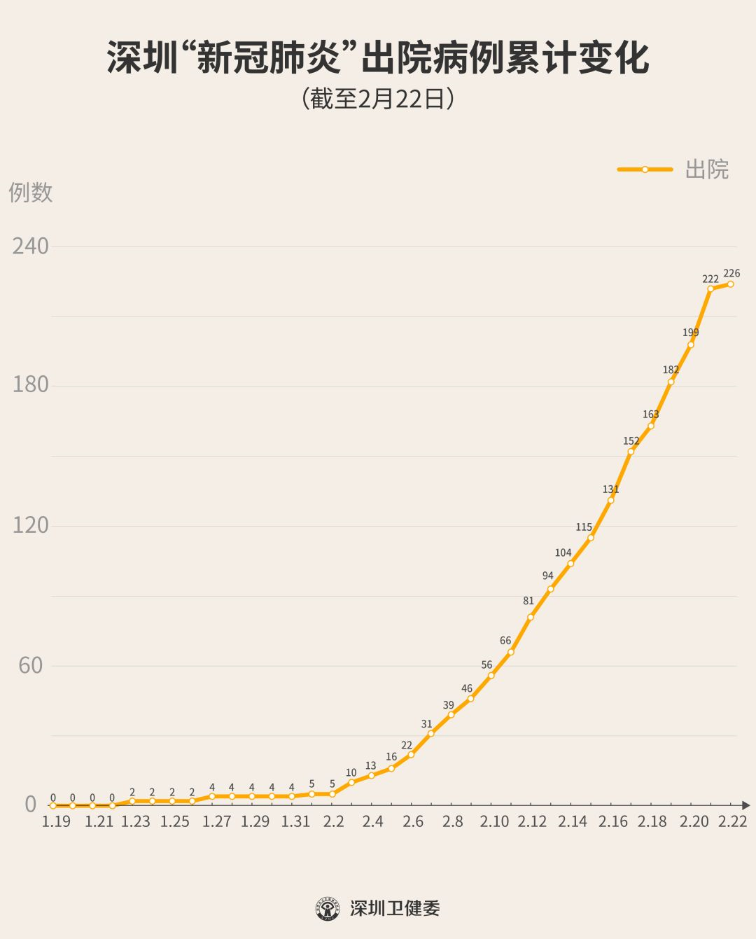 2月22日下午,經(jīng)專家組會診,深圳再有4名新型冠狀病毒肺炎確診患者出院,累計達226人,連續(xù)20天有人出院。