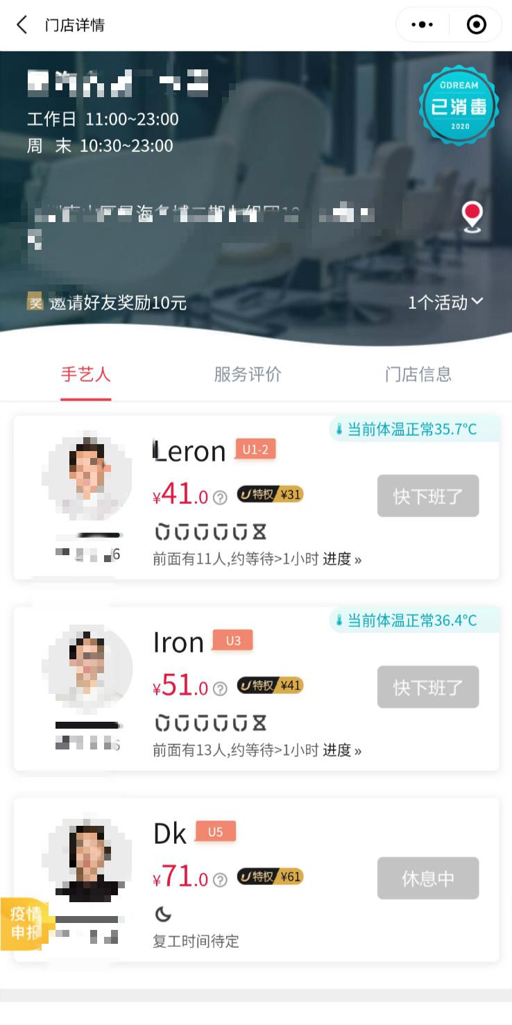 ▲通過(guò)線上平臺(tái),顧客可以清晰了解門店消毒情況及理發(fā)師個(gè)人體溫。