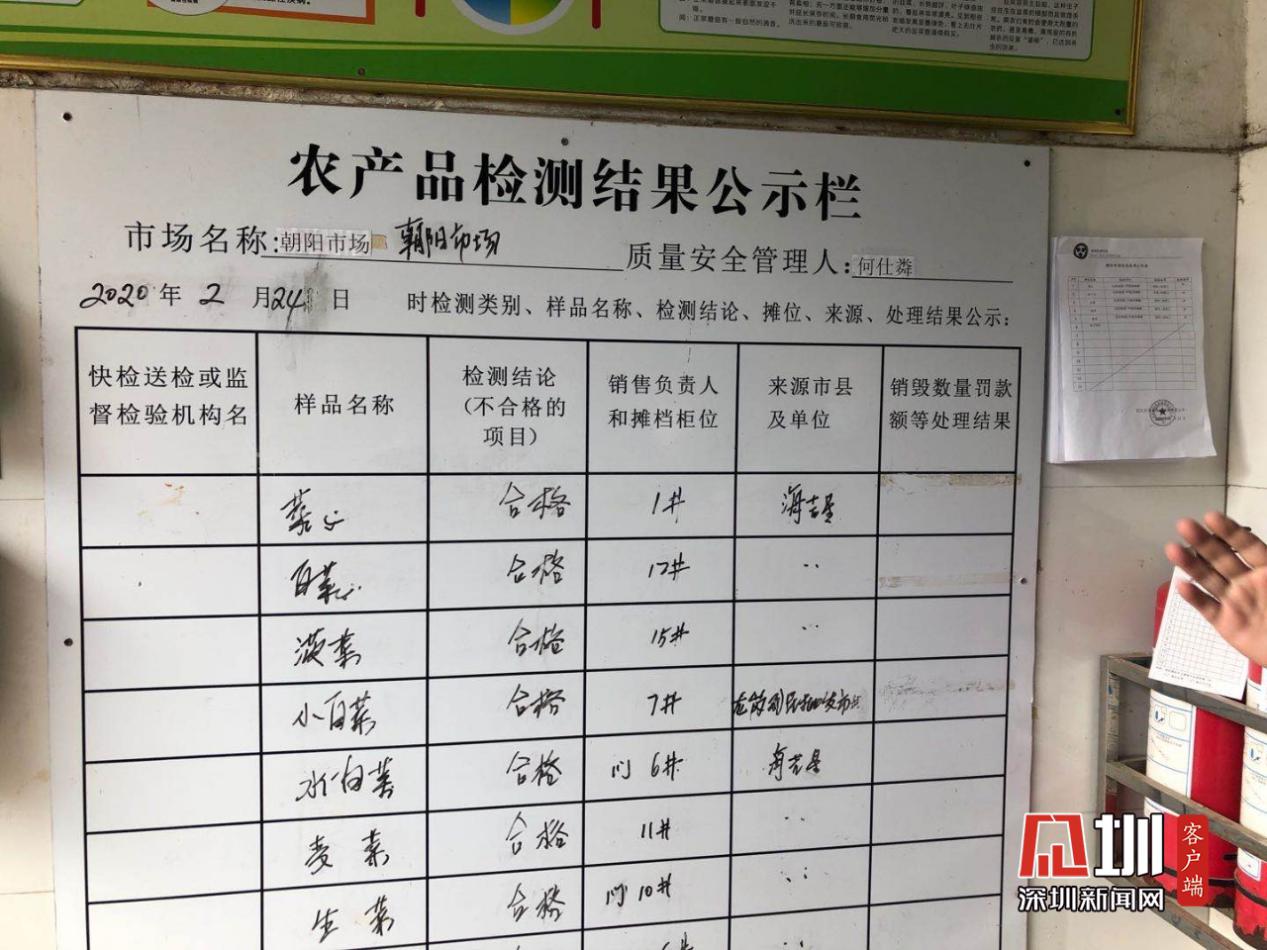 “朝陽肉菜市場從2005年開始開辦,市場占地面積為2480平方米,建筑面積和經(jīng)營面積均為2220平方米,目前市場經(jīng)營攤檔共有82檔。市場附近有三個社區(qū),每天有將近兩萬居民都會來這個市場采購食材。市場設(shè)有農(nóng)殘檢測設(shè)施,每天都會對進貨的蔬菜進行農(nóng)殘檢測并公示?!笔袌鲐撠?zé)人說道。