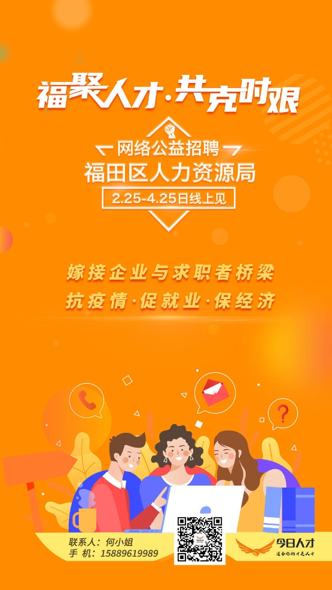 據(jù)悉,該公益網(wǎng)絡(luò)招聘將通過線上招聘會(huì)、在線直聊、視頻面試、人力資源管理信息系統(tǒng)等方式開展招聘專項(xiàng)活動(dòng),為福田區(qū)企業(yè)提供免費(fèi)招聘服務(wù),嫁接企業(yè)與求職者的橋梁,助力福田經(jīng)濟(jì)盡快走出疫情影響,促進(jìn)失業(yè)人員更快更好實(shí)現(xiàn)就業(yè)。本次活動(dòng)承接單位為深圳今日人才信息科技有限公司,活動(dòng)相關(guān)內(nèi)容會(huì)在福田區(qū)政府在線人力資源局網(wǎng)站、福田區(qū)微信公眾號(hào)上發(fā)布。