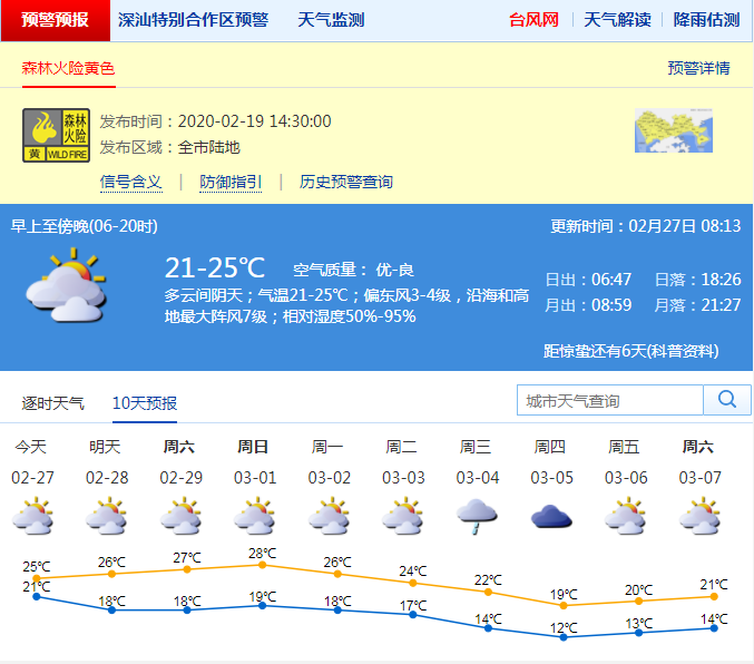 27日多云,早晨有輕霧,氣溫18-25℃,沿海及高地最大陣風(fēng)6-7級;28日至3月3日多云為主,氣溫小幅波動(dòng),早晚有輕霧,偶有零星小雨;4日冷空氣影響,北風(fēng)加大,有小雨,氣溫明顯下降。森林火險(xiǎn)黃色預(yù)警持續(xù)生效中,請注意家庭用火、用電安全。