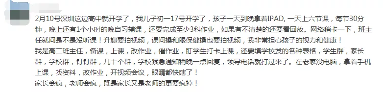 許多家長對孩子視力十分擔憂。持該意見的家長認為,目前網(wǎng)課使孩子使用電子設備時間過長,對孩子視力造成不小影響。一位高二班主任老師也表示,不僅學生的視力受到影響,老師也要每天長時間面對著手機和電腦,眼睛的健康難以保證。