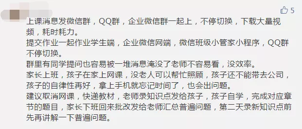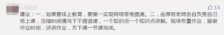 在疫情期間,如何做好“停課不停學(xué)”,許多參與者也給出自己的建議。有家長建議將目前的上課形式轉(zhuǎn)變?yōu)椤罢n題式教育”,即由老師出主題,學(xué)生獨(dú)立思考完成。