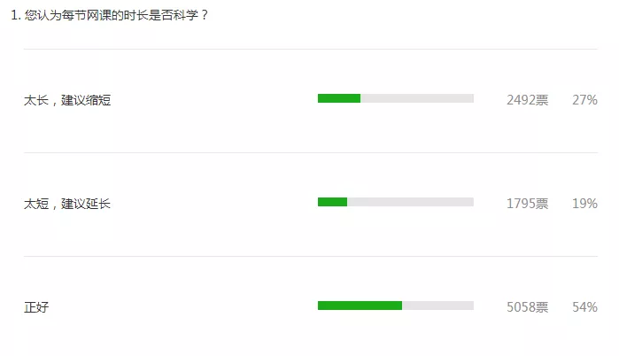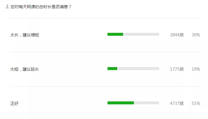 對于網(wǎng)課的時長,大部分參與者持積極態(tài)度。超過半數(shù)的網(wǎng)友認(rèn)為每節(jié)網(wǎng)課的時長和每天網(wǎng)課的總時長比較科學(xué)。