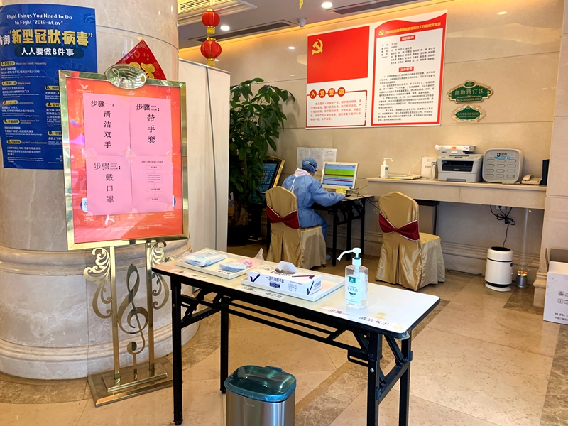 健康驛站工作人員為電梯按鍵貼上保鮮膜。