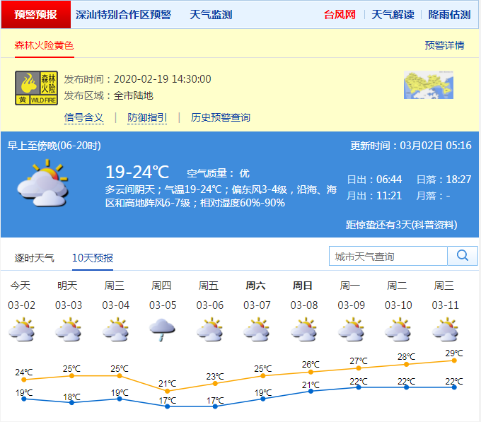 見圳客戶端·深圳新聞網(wǎng)2020年3月2日訊 深圳市氣象臺預(yù)計,3月2日深圳多云,有零星小雨,氣溫19-24℃,東北風(fēng)3-4級,沿海、海區(qū)和高地陣風(fēng)6-7級;3日多云間陰天,有零星小雨;4日多云間陰天有小雨;5-6日陰天到多云有小雨或零星小雨,氣溫略微下降;7-9日多云,氣溫逐日回升。