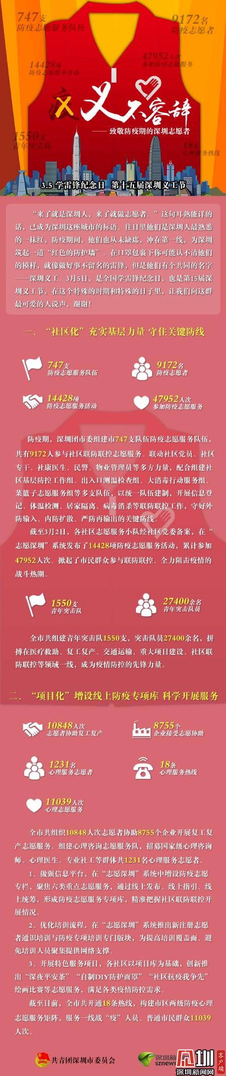 據(jù)了解,防疫期間,深圳團(tuán)市委組建747支防疫志愿服務(wù)隊(duì)伍,共9172人參與社區(qū)聯(lián)防聯(lián)控志愿服。截至3月2日,各社區(qū)志愿服務(wù)小隊(duì)經(jīng)社區(qū)黨委備案,在“志愿深圳”系統(tǒng)發(fā)布了14428項(xiàng)防疫志愿服務(wù)活動,累計(jì)參加47952人次。在深圳戰(zhàn)“疫”的關(guān)鍵時刻,全市共組建青年突擊隊(duì)1550支,突擊隊(duì)員27400余人,拼搏在醫(yī)療救助、復(fù)工復(fù)產(chǎn)、交通運(yùn)輸、重大項(xiàng)目建設(shè)、社區(qū)聯(lián)防聯(lián)控等領(lǐng)域一線,成為疫情防控的先鋒力量。