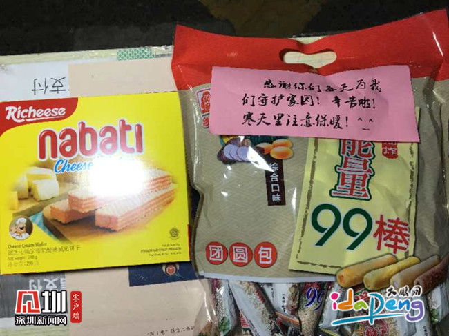2月18日晚上,一輛奔馳車停在歐新?lián)峡c(diǎn),車上下來(lái)一名女士,放下一大包零食,說(shuō)了句“辛苦了”轉(zhuǎn)身就走了……零食上還貼著一張便條:“感謝你們每天為我們守護(hù)家園!辛苦啦!寒天里注意保暖!”