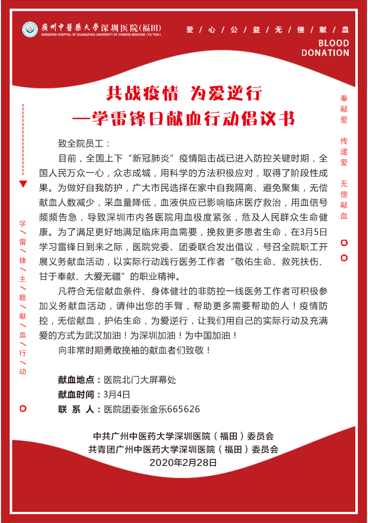 深圳新聞網(wǎng)3月5日訊(見(jiàn)圳客戶(hù)端、深圳新聞網(wǎng)記者 何靜 通訊員 馬曉群)受疫情影響,深圳市內(nèi)的血站頻頻告急,在這非常時(shí)期,為了更好地滿(mǎn)足深圳市臨床用血需要保障市內(nèi)血液供應(yīng),挽救更多患者生命,恰逢第57個(gè)“3.5學(xué)雷鋒日”到來(lái)之際,廣州中醫(yī)藥大學(xué)深圳醫(yī)院黨委、團(tuán)委聯(lián)合發(fā)出“共戰(zhàn)疫情,為愛(ài)逆行”倡議書(shū),號(hào)召全院職工開(kāi)展無(wú)償獻(xiàn)血活動(dòng)。