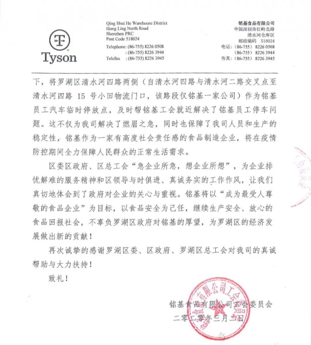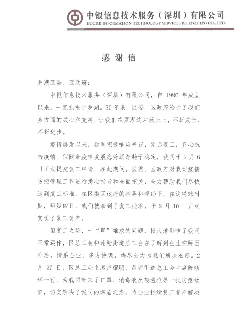 中銀信息技術(shù)服務(wù)(深圳)有限公司、銘基食品有限公司在復(fù)工復(fù)產(chǎn)后都遇到了一些困難,羅湖工會了解了他們的情況后,主動發(fā)揮工會作用,幫企業(yè)解決困難,協(xié)助他們順利復(fù)工復(fù)產(chǎn)。近日,兩封感謝信送到了羅湖區(qū)委、區(qū)政府,向羅湖羅湖區(qū)委、區(qū)政府以及羅湖各級工會為企業(yè)的付出表示感謝。