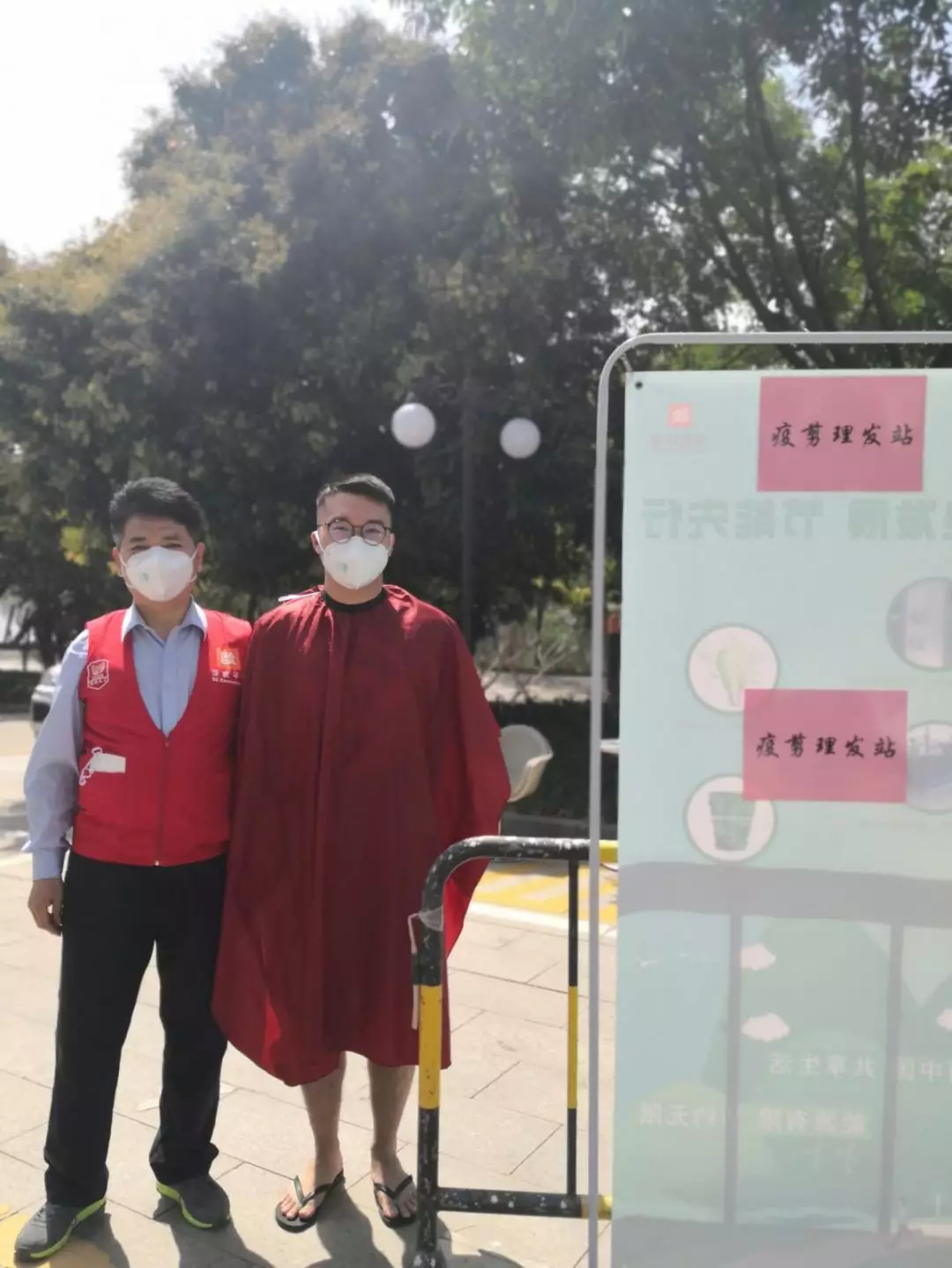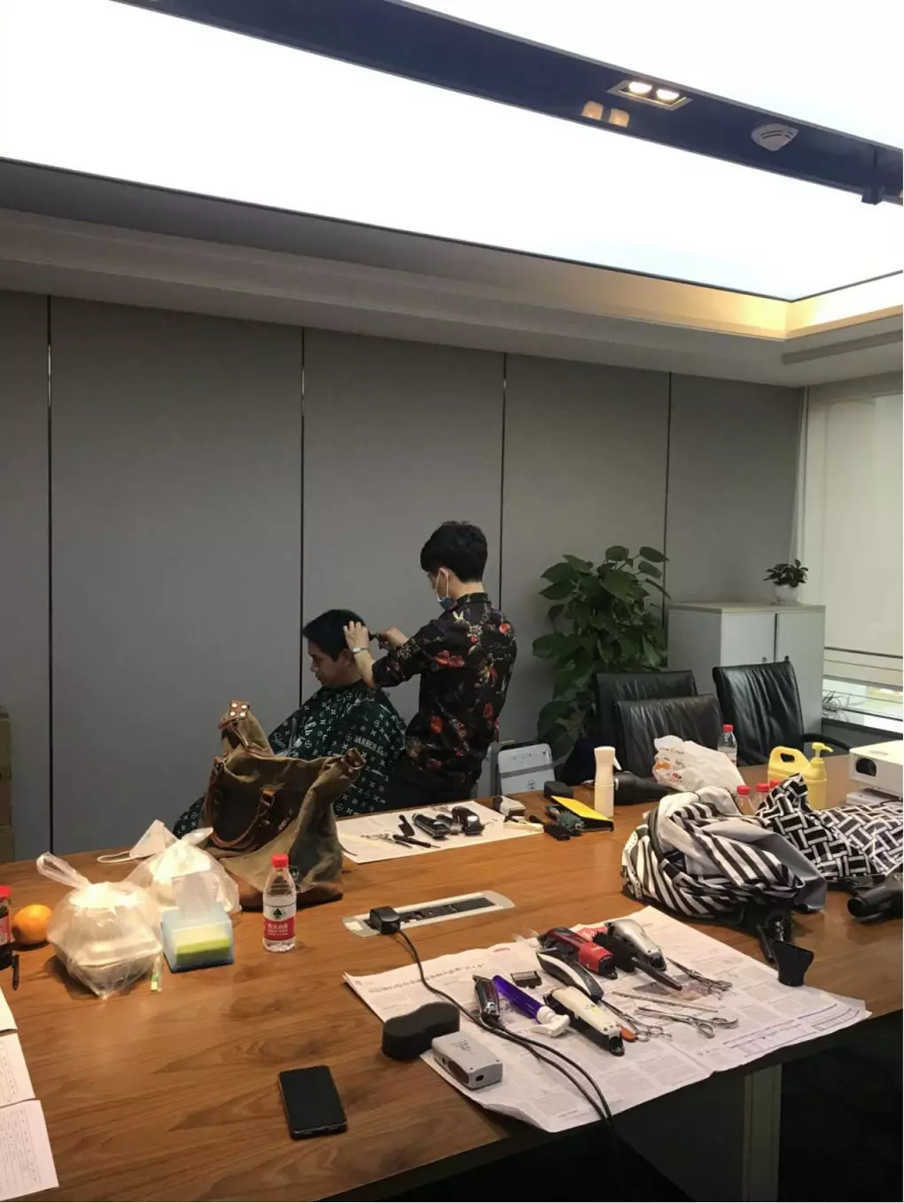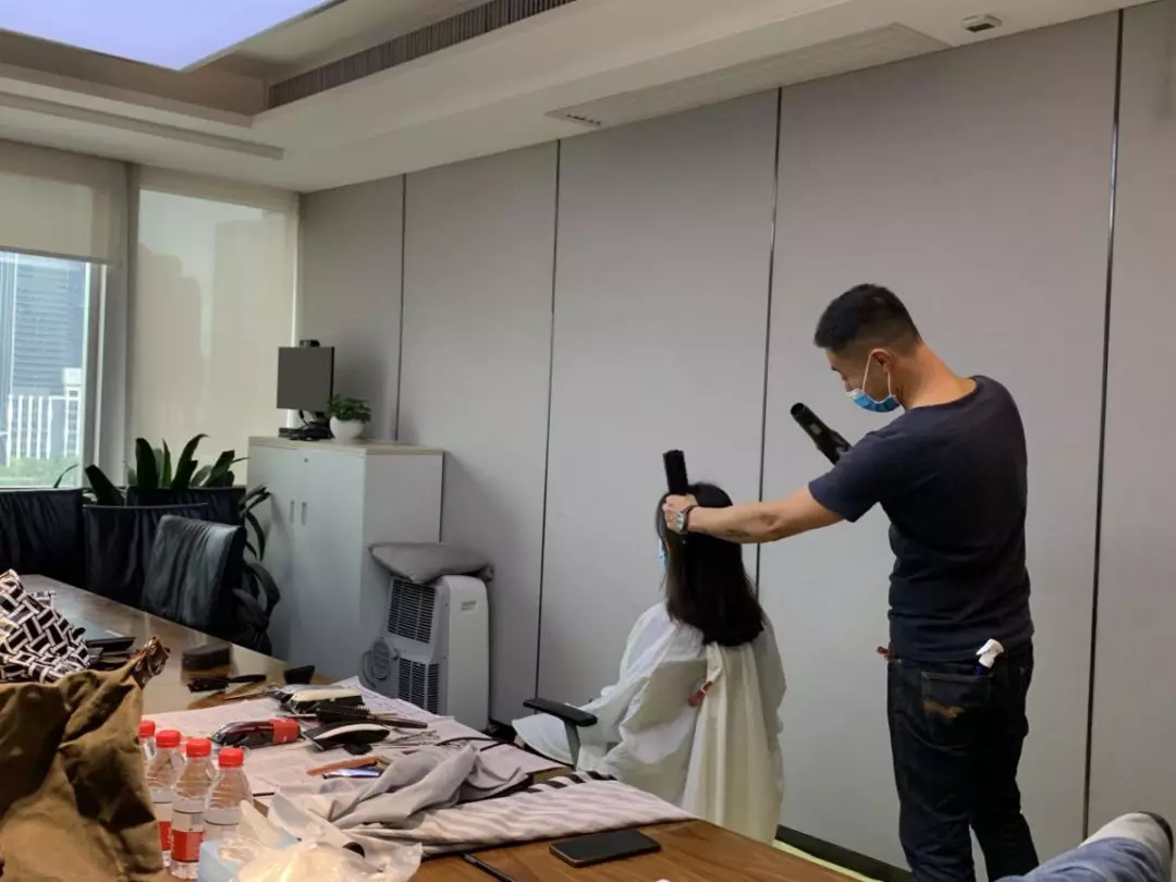 公司本部,1303會議室,臨時理發(fā)室“生意”也火爆極了。公司工會邀請了兩名專業(yè)的Tony老師,為近90名員工提供免費的理發(fā)服務(wù)。為減少人員聚集,理發(fā)采取提前線上預(yù)約,分時段進行,確保安全的同時,盡可能讓有需要的同事都能理上發(fā)。鋪上一次性地毯,坐上椅子,圍上一次性“斗篷”,Tony老師一頓熟練的剪發(fā)操作后,再用吹風機整好造型,就完成了理發(fā)的全過程。臨時理發(fā)師的搭建,有效解決了員工生活上的困難,幫助他們以良好的精神面貌投入工作來。