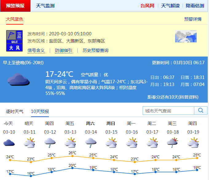 盡管冬天已經(jīng)過(guò)去,但是當(dāng)下的深圳乍暖還寒,氣溫變化較大,需要依據(jù)氣溫變化增減衣物,以防感冒。受新一股冷空氣影響,10日早晨有陣雨,伴零散雷暴,北風(fēng)加大,沿海、海區(qū)和高地有7級(jí)左右陣風(fēng)。10日白天降雨結(jié)束,可見陽(yáng)光,氣溫略降3-4℃,氣溫18-23℃。11日氣溫下降至16℃左右,天氣轉(zhuǎn)涼。12-13日氣溫明顯回升。 (記者董思)