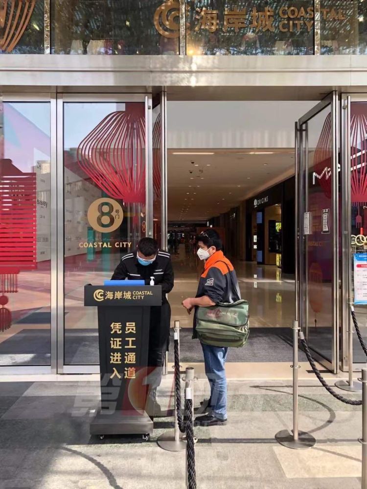 以往南山區(qū)的海岸城人聲鼎沸,如今商場只保留3個出入口,所有人員進出都需要進行測溫和信息登記,客服臺提供酒精消毒液。據(jù)工作人員介紹,保潔一小時消殺一次,疫情期間,商場停掉了所有的垂直電梯,只保留了通風(fēng)的扶手電梯。