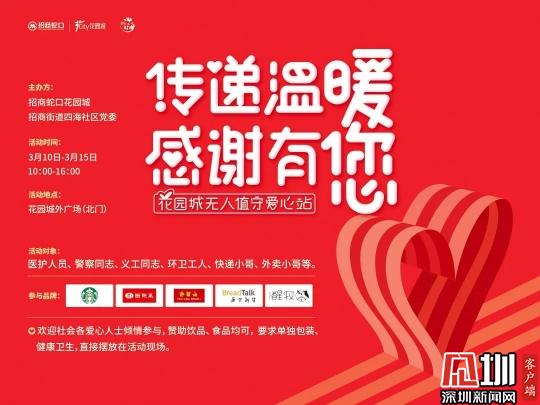 見(jiàn)圳客戶(hù)端·深圳新聞網(wǎng)訊(記者 王志明)他們奔波勞累,保障我們生活的秩序與安全他們勇敢逆行盡力守護(hù)城市的正常運(yùn)轉(zhuǎn):醫(yī)護(hù)人員、警察同志、社區(qū)工作人員、義工同志、環(huán)衛(wèi)工人、快遞小哥、外賣(mài)小哥……今天的招商街道,多了一道靚麗的風(fēng)景線。 為了向這群最可愛(ài)的人表達(dá)我們的感恩、感動(dòng),招商街道四海社區(qū)黨委攜手招商蛇口花園城,共同開(kāi)啟“無(wú)人值守愛(ài)心站”公益活動(dòng),每天提供上千份愛(ài)心食品免費(fèi)領(lǐng)取,感謝在這座城市里那些不斷奔波守護(hù)著大家生活的平凡英雄們。 活動(dòng)時(shí)間:3月10日至3月15日 活動(dòng)地點(diǎn):花園城外廣場(chǎng) 活動(dòng)對(duì)象:醫(yī)護(hù)人員、警察同志、社區(qū)工作人員、 義工同志、環(huán)衛(wèi)工人、快遞小哥、外賣(mài)小哥等 除了星巴克、面包新語(yǔ)、面點(diǎn)王、許留山、醒牧等商家熱心公益傾情參與此次公益活動(dòng),花園城的許多員工也自發(fā)的采購(gòu)起來(lái),抱著一份份愛(ài)與尊敬時(shí)刻補(bǔ)貨,用自己微小的力量幫助著逆行者們。 花園城無(wú)人值守愛(ài)心站活動(dòng)時(shí)間為3月10日至15日,持續(xù)6天,歡迎社會(huì)愛(ài)心人士?jī)A情參與食品贊助,所提供物品采用單獨(dú)包裝、健康衛(wèi)生,直接擺放在活動(dòng)現(xiàn)場(chǎng)即可。 春暖花開(kāi),山河無(wú)恙,人間皆安。待疫情結(jié)束,我們定會(huì)溫暖相遇在這座鮮花簇?fù)淼某鞘欣铩?/p>