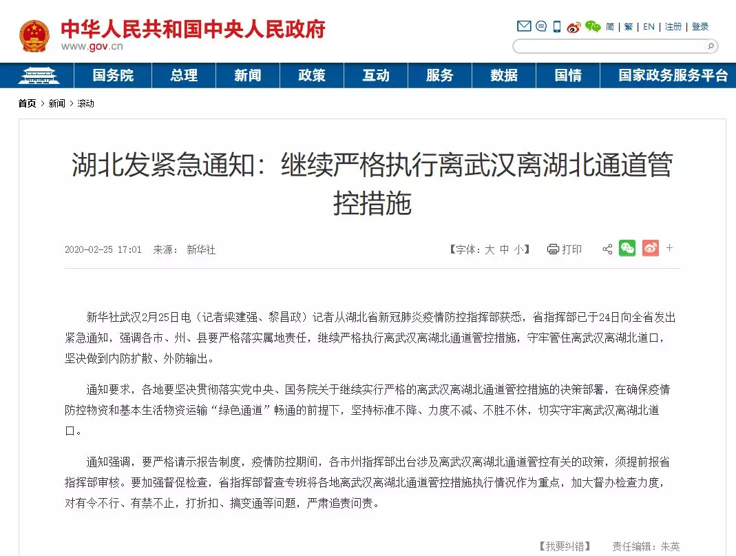 根據湖北的緊急通知,繼續(xù)嚴格執(zhí)行離武漢離湖北通道管控措施。