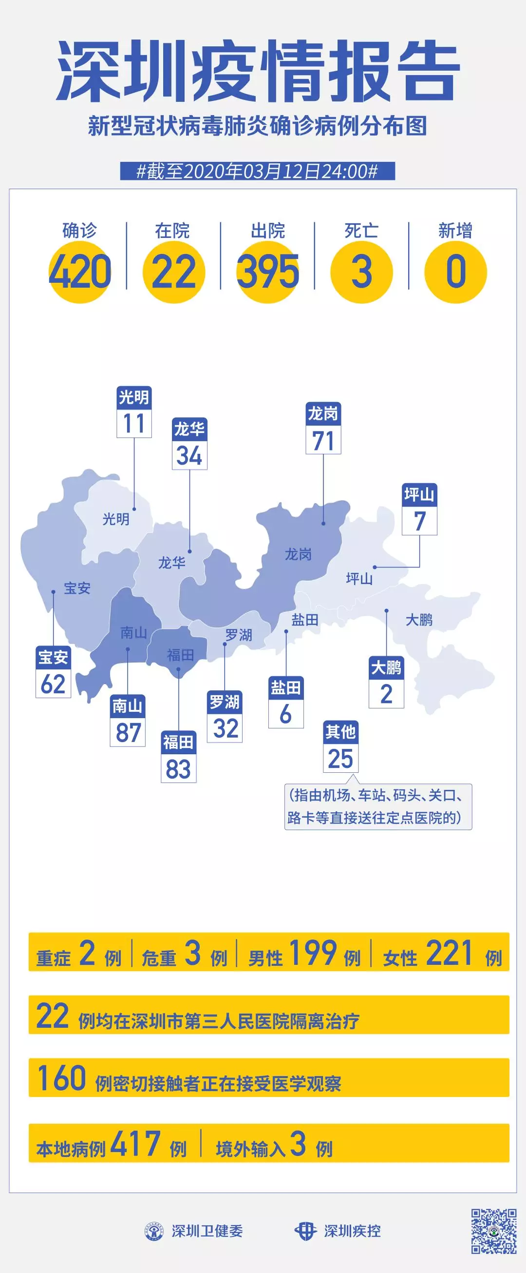 截至3月12日24時,深圳累計報告“新冠肺炎”確診病例420例。3月12日當(dāng)天全市無新增確診病例,當(dāng)天出院病例3例。