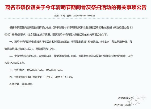 茂名市殯儀館提供限制性祭掃服務(wù),清明節(jié)期間的骨灰祭掃實(shí)行電話實(shí)名制預(yù)約,每天限制祭掃180份骨灰,分6批次;每批祭掃30份,每份骨灰祭掃人數(shù)在3人以內(nèi),祭掃時間為1小時。