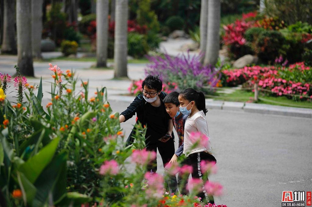 一位家長(zhǎng)帶著孩子們觀(guān)賞鮮花。