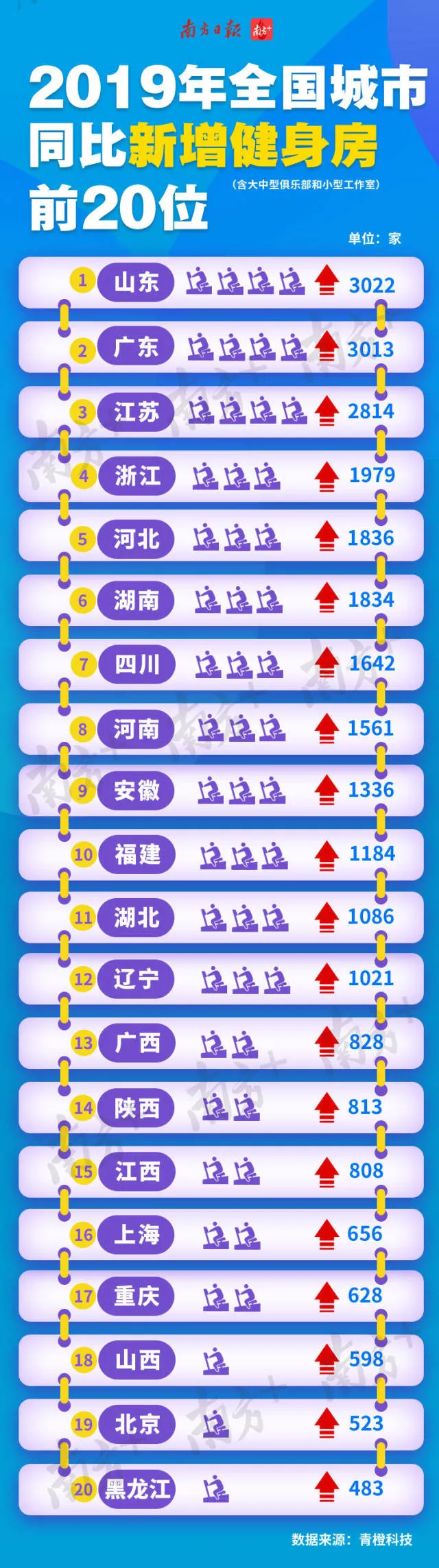 2019年同比增長了3013間健身房。增長數量位居全國第二,同期僅關閉127家健身房。