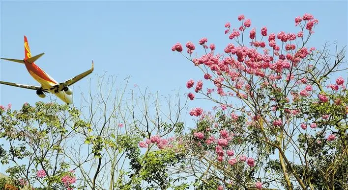 寶安航城街道機場南路兩旁,風鈴木花綻放。