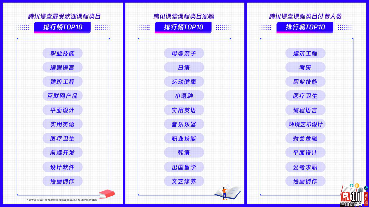 見圳客戶端·深圳新聞網(wǎng)2020年3月18日訊(見圳客戶端、深圳新聞網(wǎng)記者 劉夢(mèng)婷)近日,在線職業(yè)教育平臺(tái)騰訊課堂發(fā)布數(shù)據(jù)報(bào)告:戰(zhàn)“疫”宅家期間,該平臺(tái)上課總時(shí)長(zhǎng)提升3.5倍。同時(shí),騰訊課堂還發(fā)布了最受歡迎課程類目(學(xué)習(xí)人數(shù))排行榜TOP10:職業(yè)技能、編程語言、建筑工程、互聯(lián)網(wǎng)產(chǎn)品、平面設(shè)計(jì)、實(shí)用英語、醫(yī)療衛(wèi)生、前端開發(fā)、設(shè)計(jì)軟件、繪畫創(chuàng)作。此外母嬰親子、日語、運(yùn)動(dòng)健康等課程學(xué)習(xí)人數(shù)同比漲幅均超過400%,成騰訊課堂增速最快類目,或成為未來在線職業(yè)教育新的增長(zhǎng)點(diǎn)。IT互聯(lián)網(wǎng)就業(yè)類課程、工業(yè)產(chǎn)品設(shè)計(jì)類課程付費(fèi)能力強(qiáng),付費(fèi)人數(shù)同比漲幅超過50%。