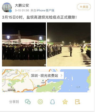 3月15日,深圳撤銷全部49個入深車輛道路交通聯(lián)合檢疫點,各條入深道路恢復正常通行。