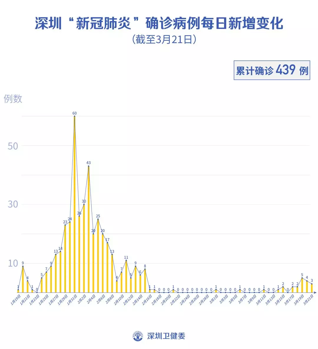 截至3月21日24時,深圳累計報告“新冠肺炎”病例439例。3月21日當天新增3例,出院1例。