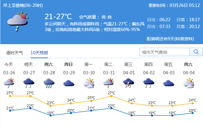 見(jiàn)圳客戶端·深圳新聞網(wǎng)2020年3月26日訊 今日深圳多云間陰天,有陣雨或雷陣雨;氣溫21-27℃。受偏南暖濕氣流影響,最近深圳天氣溫暖,氣溫回升明顯,最低氣溫在20℃以上,連續(xù)4天最高氣溫突破28℃。